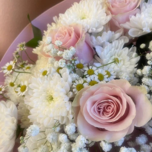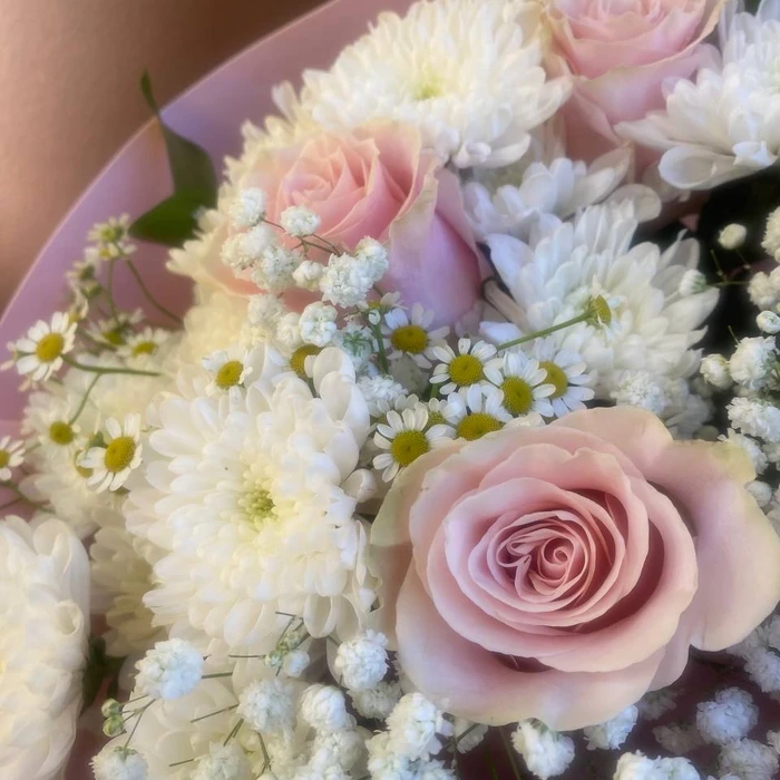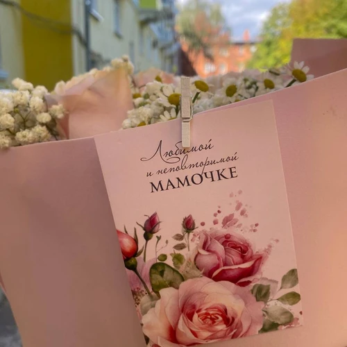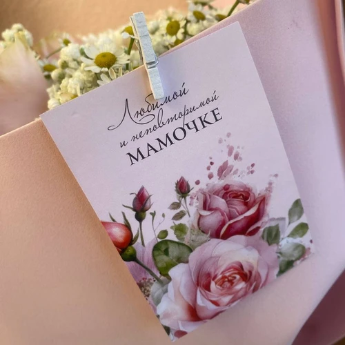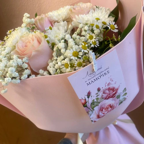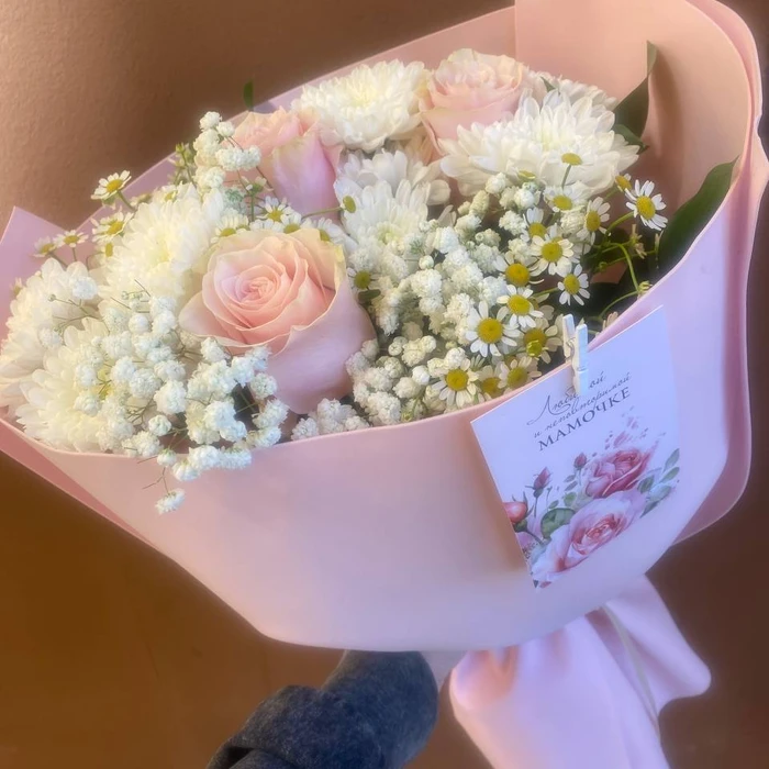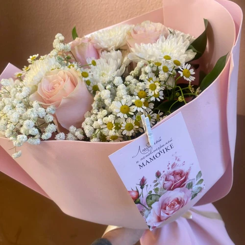 Тепло и забота в каждом лепестке! 💝 Авторский букет «Любимой маме» – это больше, чем просто цветы. Это ваши чувства, воплощенные в композиции из роз, хризантем, ромашек и гипсофилы. 🌼 Компактный и элегантный размер (35х45 см) подойдёт для любого интерьера.