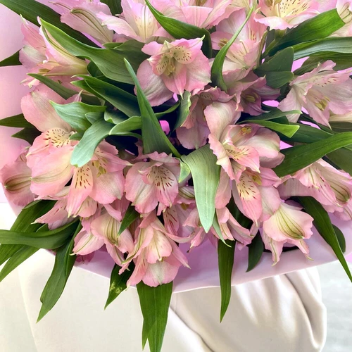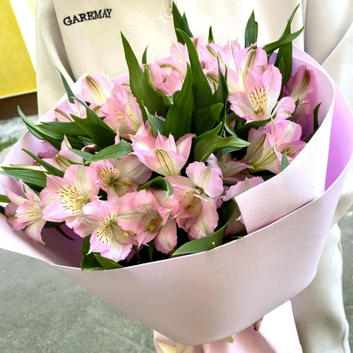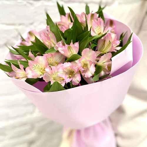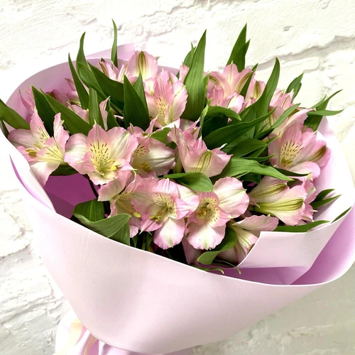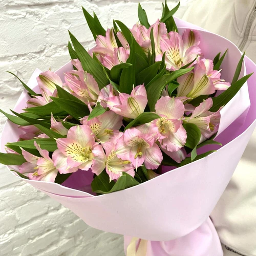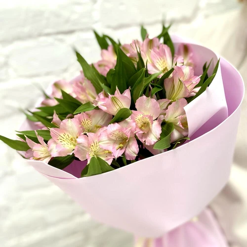 Элегантный букет из семи изысканных альстромерий нежно-розового оттенка — воплощение природной красоты и утонченности. Эти изящные цветы, словно маленькие шедевры природы, создают атмосферу тепла и
